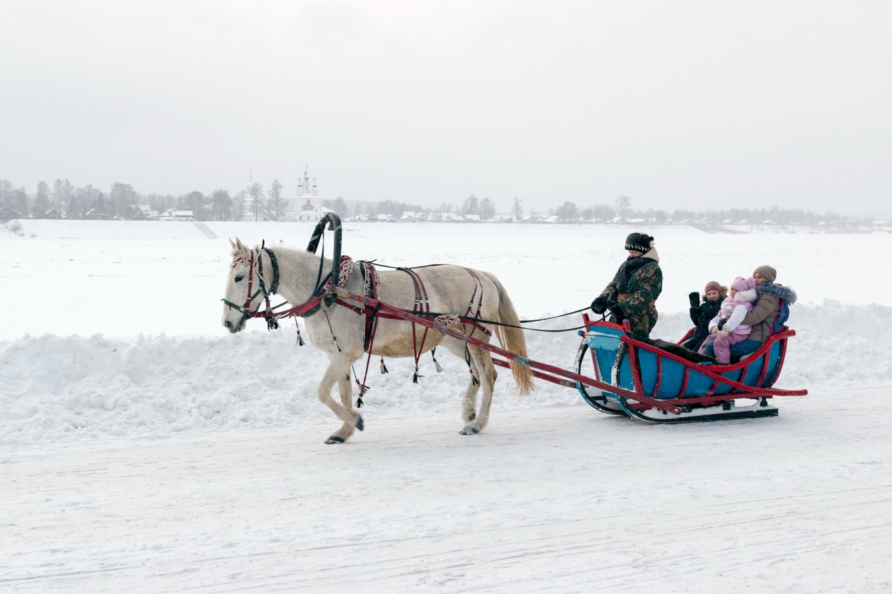 In winter, Russians traditionally traveled in horse-drawn sleighs. You can try this mode of transport and take a family ride through the snowy landscape.