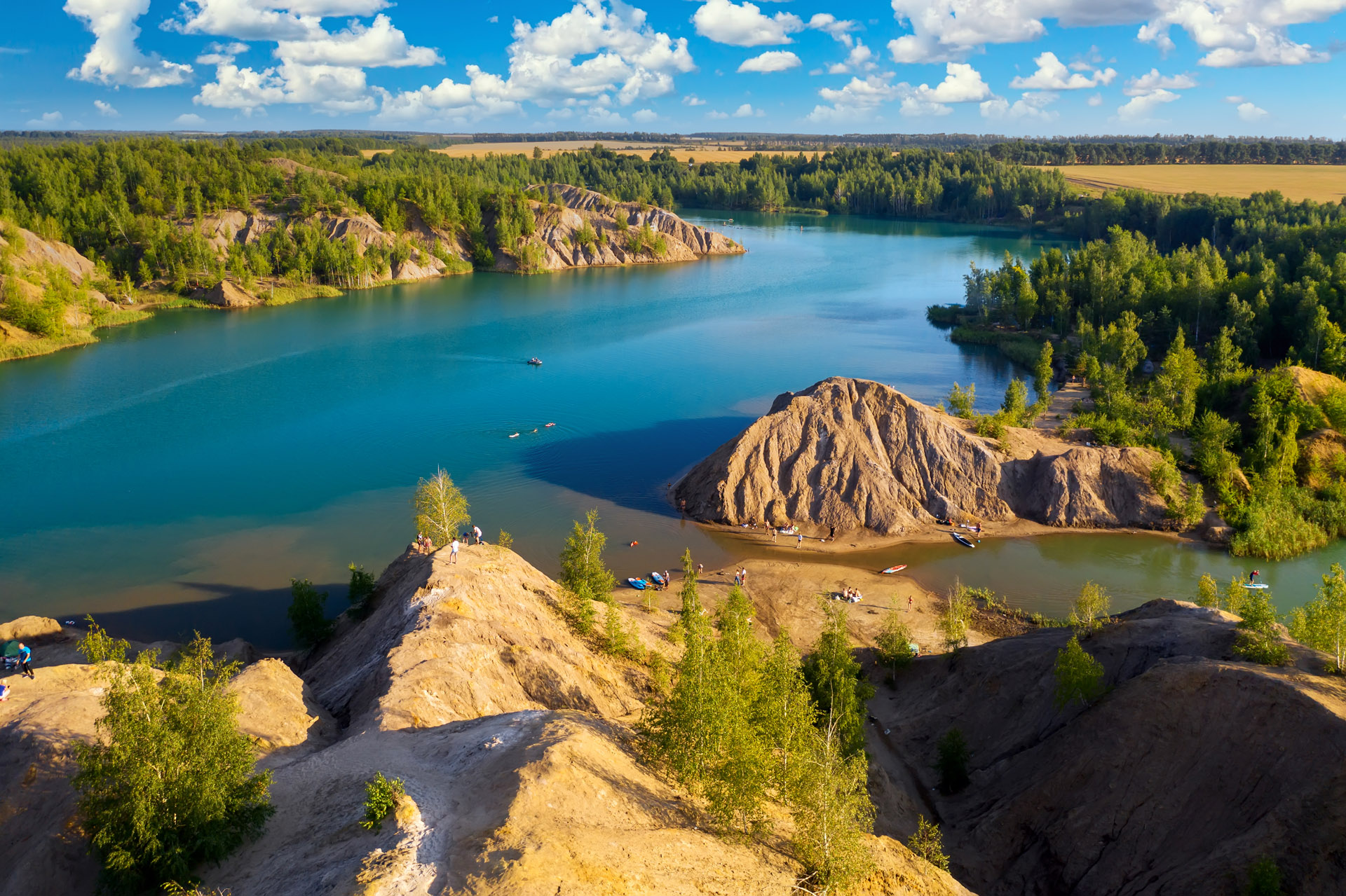 An hour and a half from Tula, former coal quarries have turned into a fantastic landscape. After the mines closed, 27 turquoise lakes up to 79 meters deep formed here, and the heaps of waste rock created Martian-like landscapes in red-brown hues.