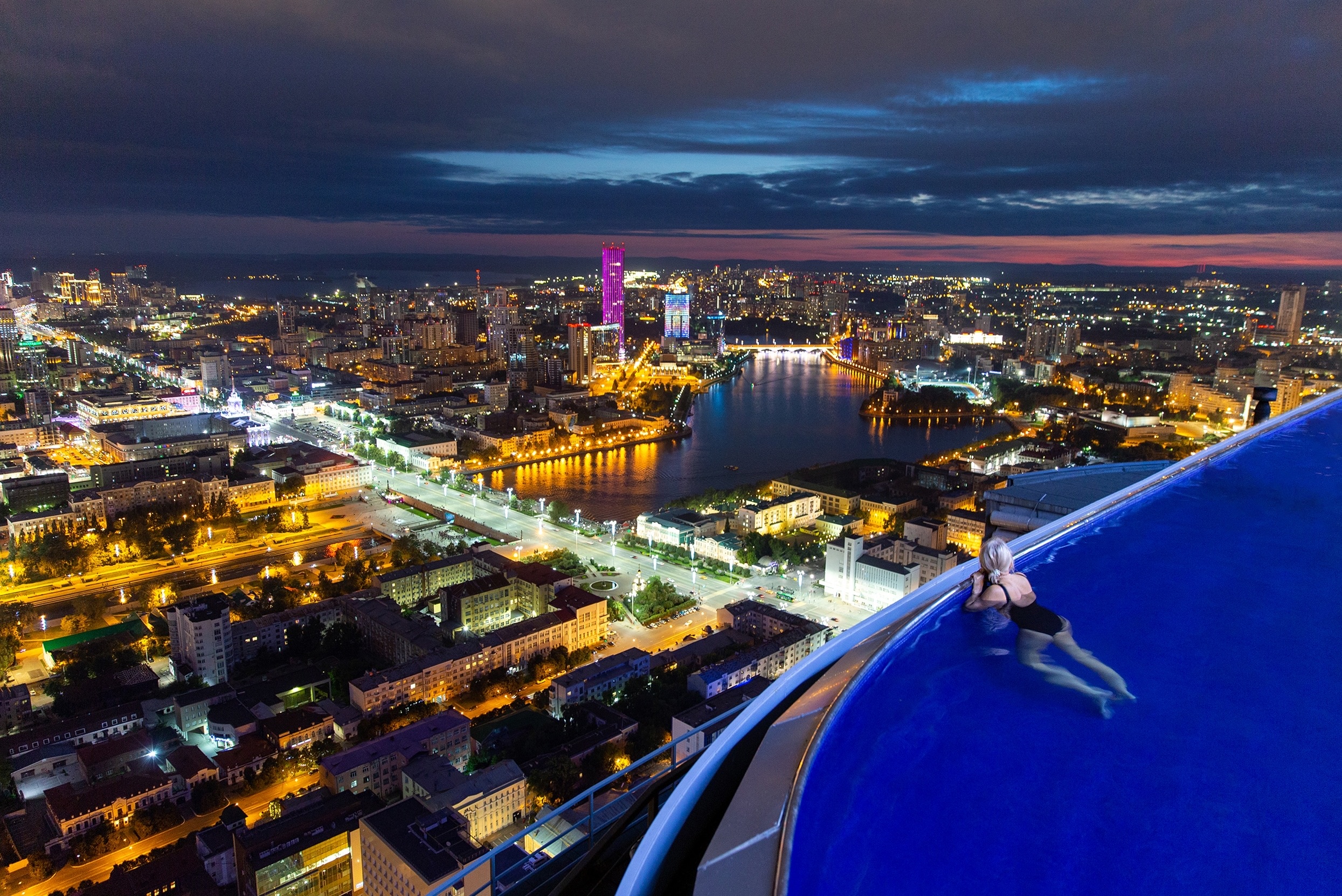 Sky infinity pool — a Ural exclusive. The only rooftop pool on a skyscraper in the country and a trendy meeting place for all nightlife lovers. The pool is on the roof of the Vysotsky high-rise. Its main feature is that the pool has no visible edges; excess water flows straight down.